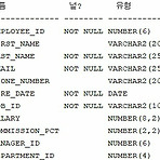 describe [테이블명]; desc [테이블명]; describe 명령을 이용해 테이블의 구조를 확인할 수 있으며, 축약형인 desc 로 줄여 사용할 수 있다. describe employees; desc employees; ▶ '이름' 은 각 칼럼의 이름, '널?' 은 각 칼럼이 null 을 허용하는지, '유형' 은 각 칼럼의 데이터 유형을 나타낸다. NUMBER ( p , s ) : 최대 자릿수가 p이고 소수점 이하 자릿수가 s인 숫자 값 VARCHAR2 ( s ) : 최대 길이가 s인 가변 길이 문자 값 DATE : 기원전 4712년 1월 1일에서 기원후 9999년 12월 31일 사이의 날짜 및 시간 값